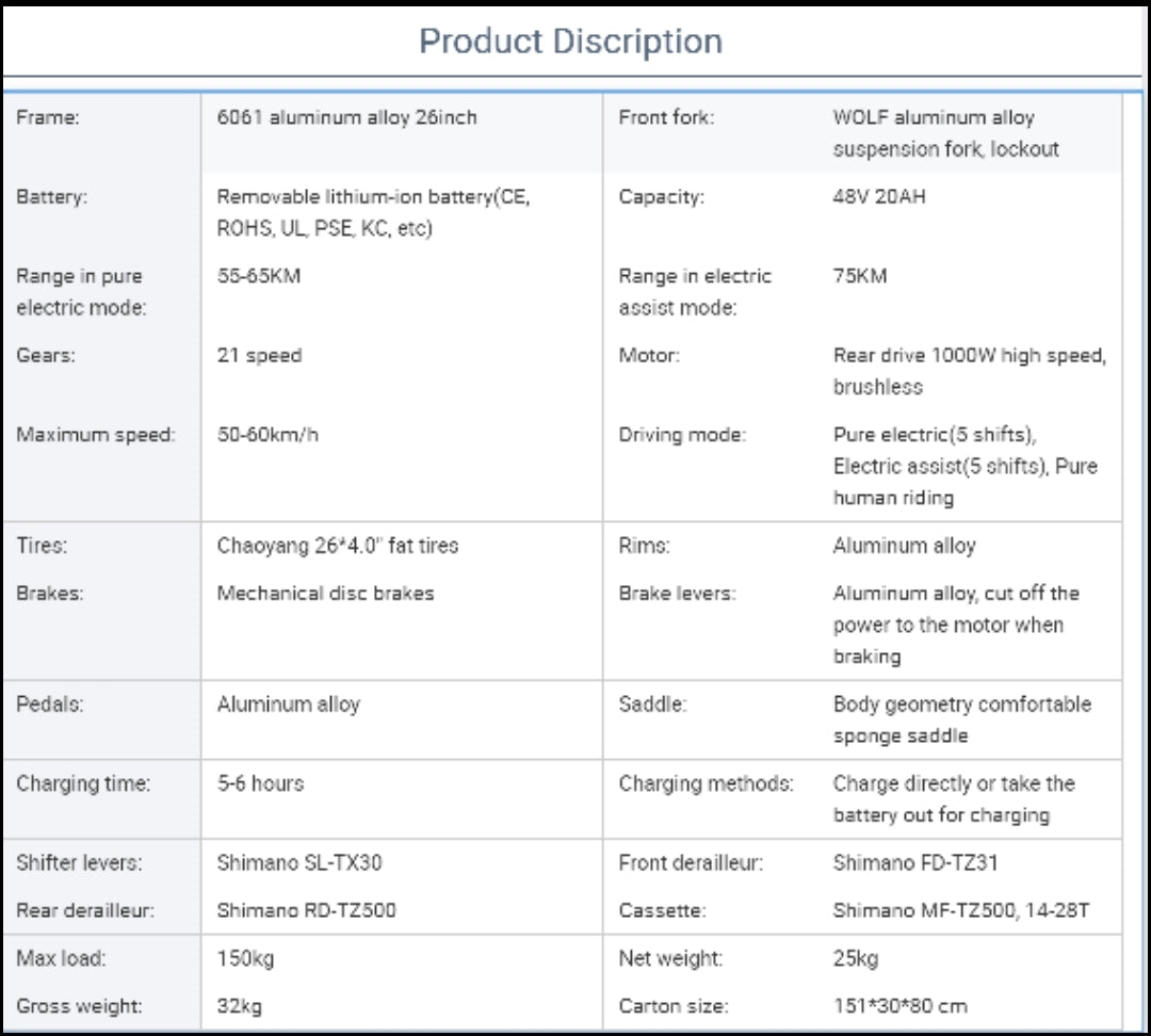 |  Battery: | 48V - 20Ah Lithium Battery |